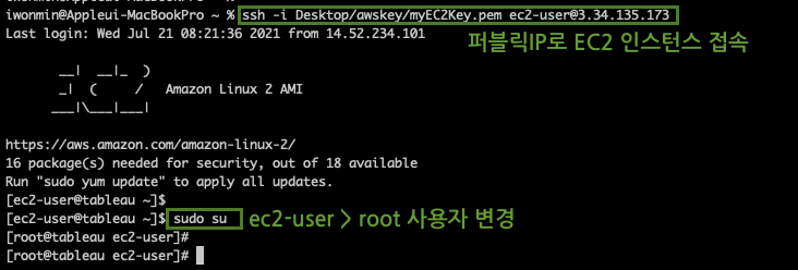 그리고, 터미널을 이용하여 인스턴스에 접속합니다.
