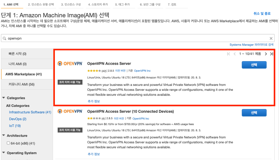 우리가 사용할 AMI는 "OpenVPN Access Server" 이며, 라이선스를 BYOL하거나 무료로 2개세션까지 쓸 수 있는 버전입니다.