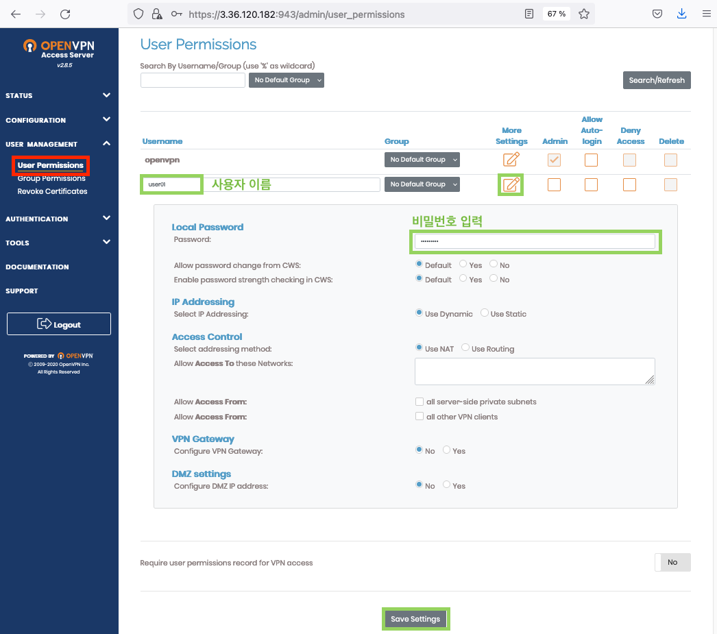 저는 user01 사용자를 생성할 예정이며, 비밀번호만 추가로 입력해주고 "Save Settings"를 클릭합니다.