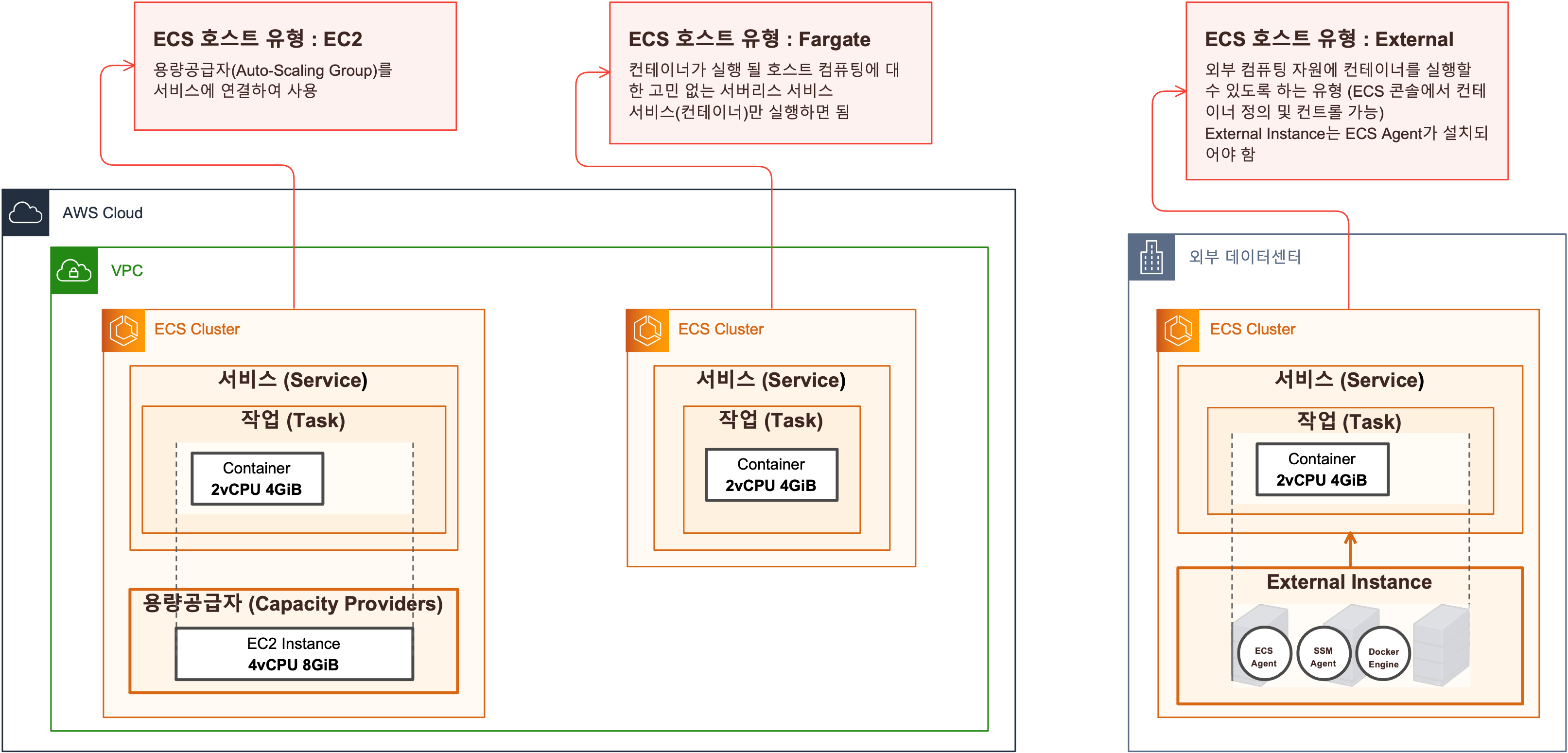 마지막 유형인데요, Exrernal 인스턴스 타입입니다. 이 유형은 AWS인프라가 아닌 곳에 위치한 호스트에서도 ECS에서 정의한 서비스, 작업을 실핼 할 수 있도록 합니다.