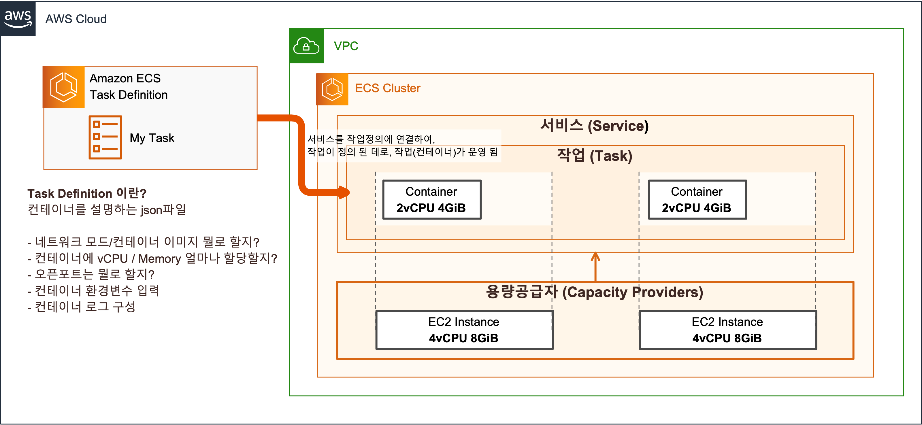 (Task 네트워크 모드(Bridge, Host, awsvpc, None)/ 컨테이너 이미지/ 컨테이너에 할당 될 리소스(vCPU/MEM) 등..)