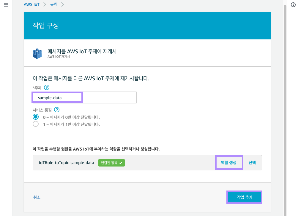 1. 첫번째 규칙 생성 - 메세지를 AWS IoT 주제에 개시