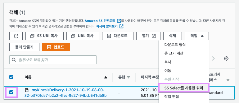 해당 파일을 선택하고, 오른쪽 상단 "작업" -> "S3 Select를 사용한 쿼리"를 클릭합니다.