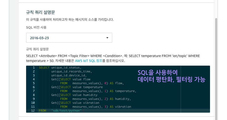 IoT Core는 이 쿼리를 통해 데이터를 변환하거나 필터링 할 수 있습니다.