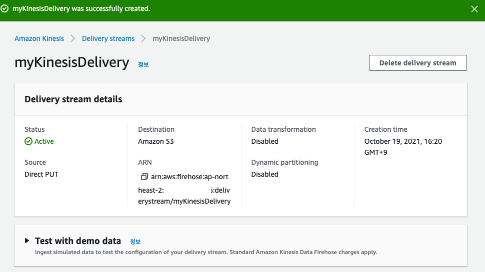 Kinesis Firehose도 생성이 완료 되었습니다!
