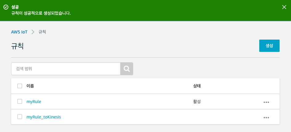 두번째 규칙, Kinesis로 데이터를 보내는 규칙을 생성 완료했습니다.