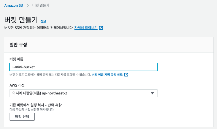 나머지는 전부 그대로 두고, 아래로 스크롤 다운 하여 "버킷만들기"를 클릭합니다.