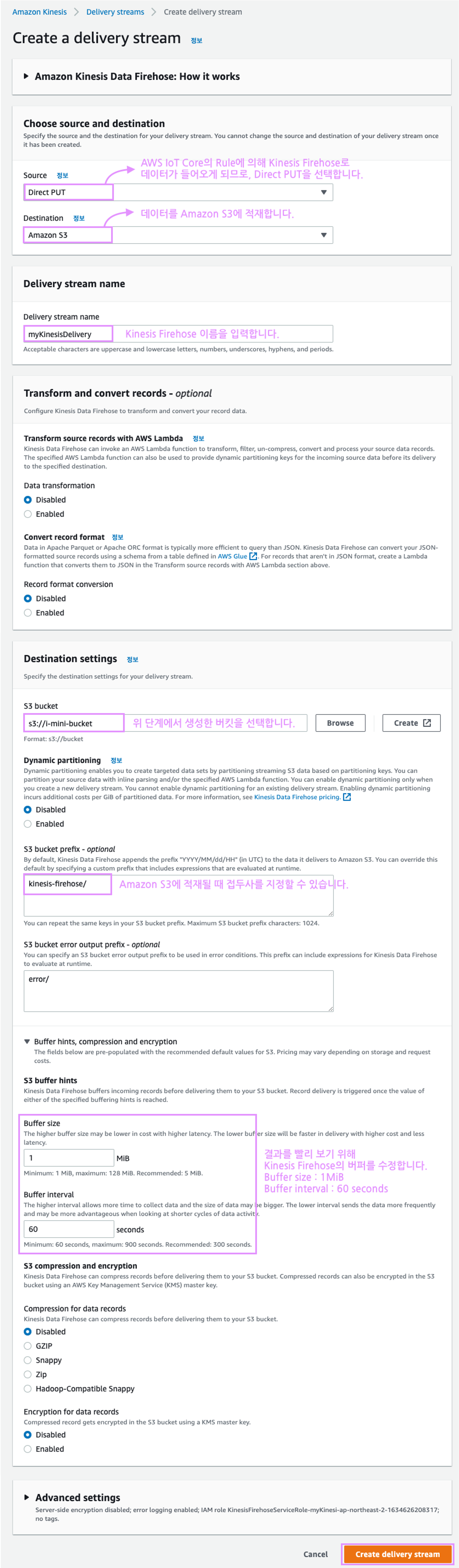 Kinesis Firehose를 아래 캡쳐 내용을 보면서 생성하세요!