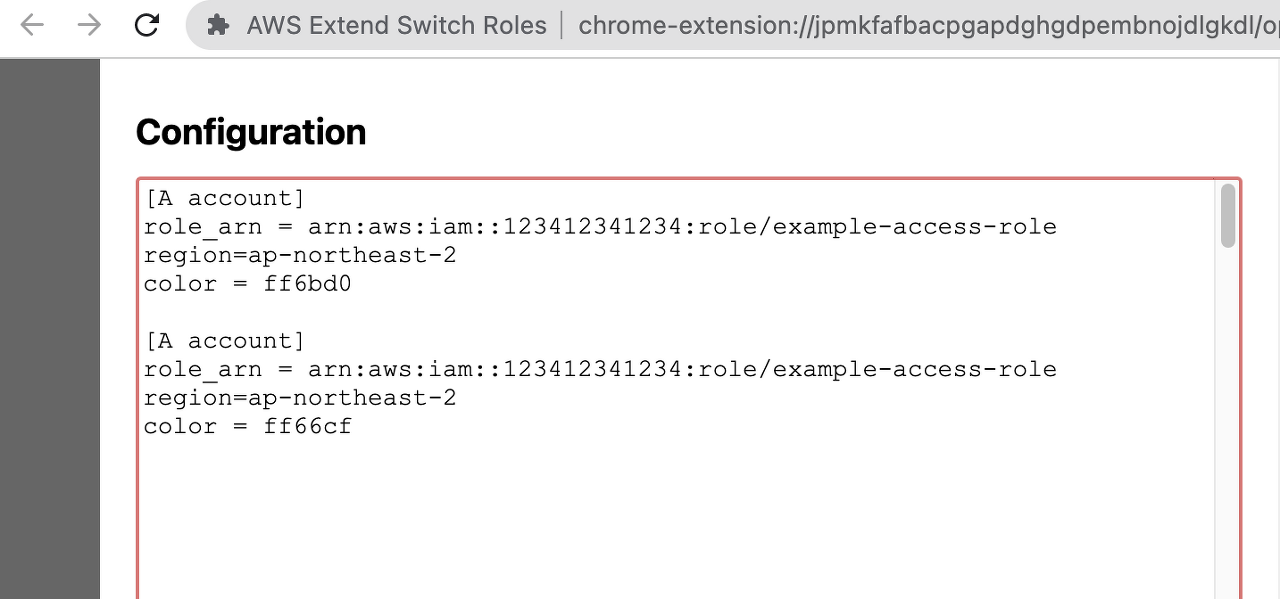크롬 AWS Extend Switch Roles을 설치하고, Configureation을 수정합니다.