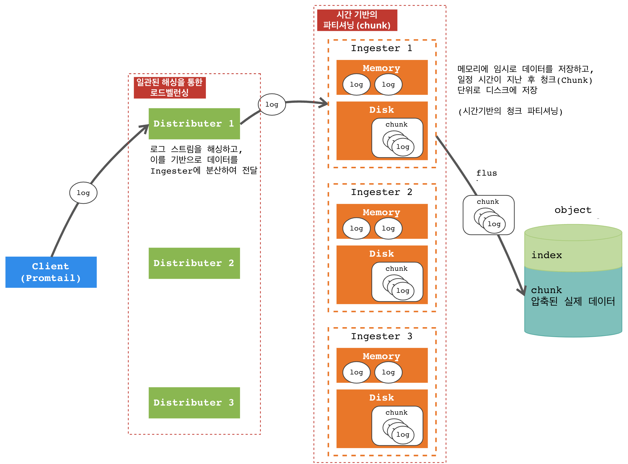 In order to mitigate the chance of losing data on any single ingester, the distributor will forward writes to a replication_factor of them. Generally, this is 3. Replication allows for ingester restarts and rollouts without failing writes and adds additional protection from data loss for some scenarios. Loosely, for each label set (called a stream) that is pushed to a distributor, it will hash the labels and use the resulting value to look up replication_factor ingesters in the ring (which is a subcomponent that exposes a distributed hash table). It will then try to write the same data to all of them. This will error if less than a quorum of writes succeed. A quorum is defined as floor(replication_factor / 2) + 1. So, for our replication_factor of 3, we require that two writes succeed. If less than two writes succeed, the distributor returns an error and the write can be retried.