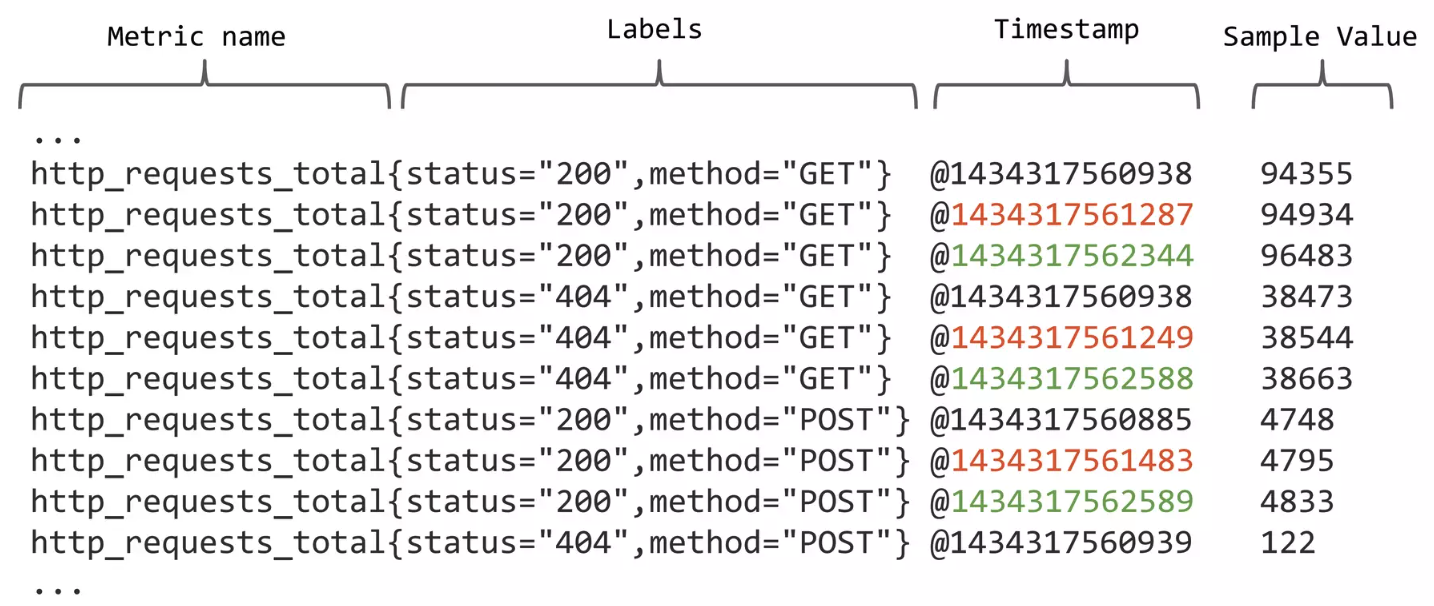 status 레이블은 "200", "400", "500" 등의 값이 있을 수 있고, method 레이블은 "GET", "POST"값을 가질 수 있다고 가정할 때 Prometheus는 각각의 레이블 조합에 대해 별도의 시계열 데이터를 생성한다.