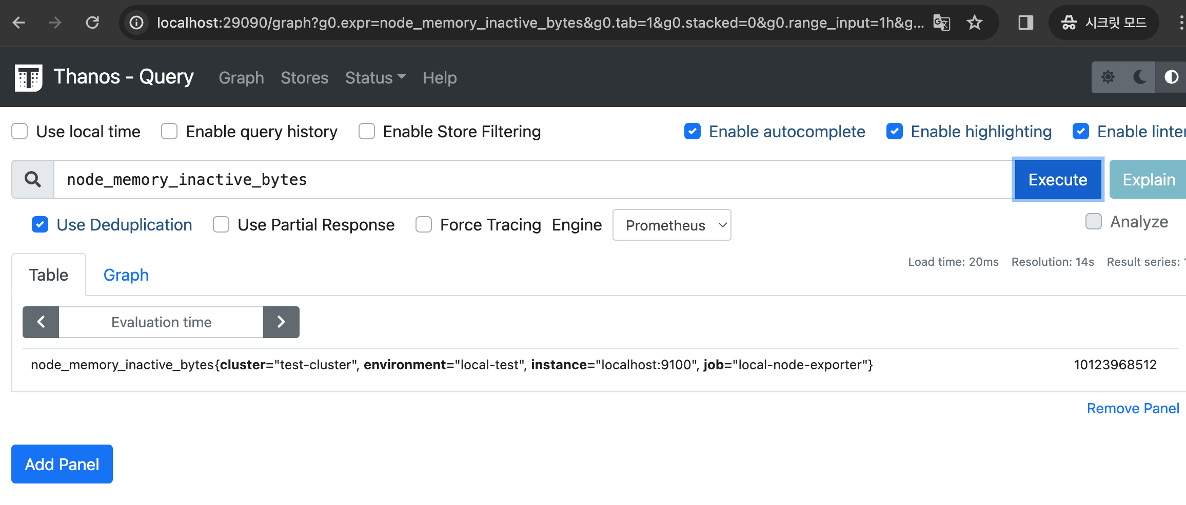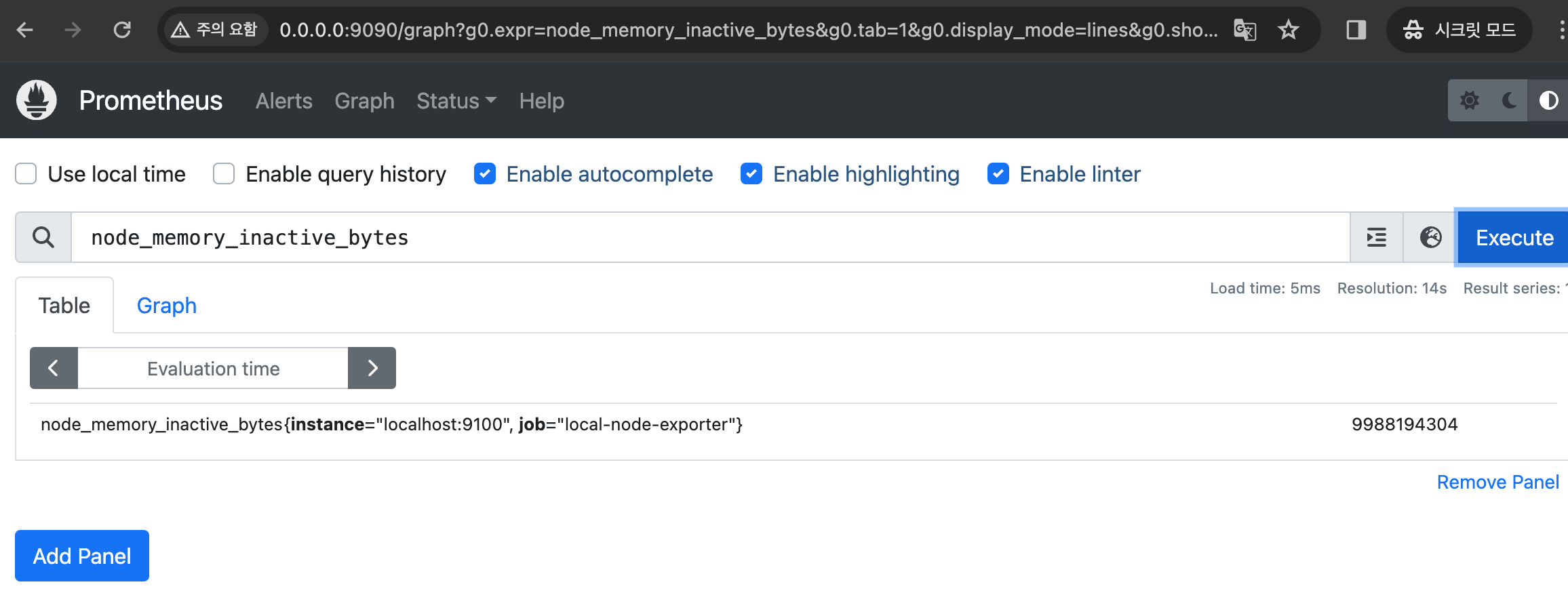 접속 후 node_memory_inactive_bytes 등 node_exporter에서 수집된 메트릭도 확인할 수 있다.