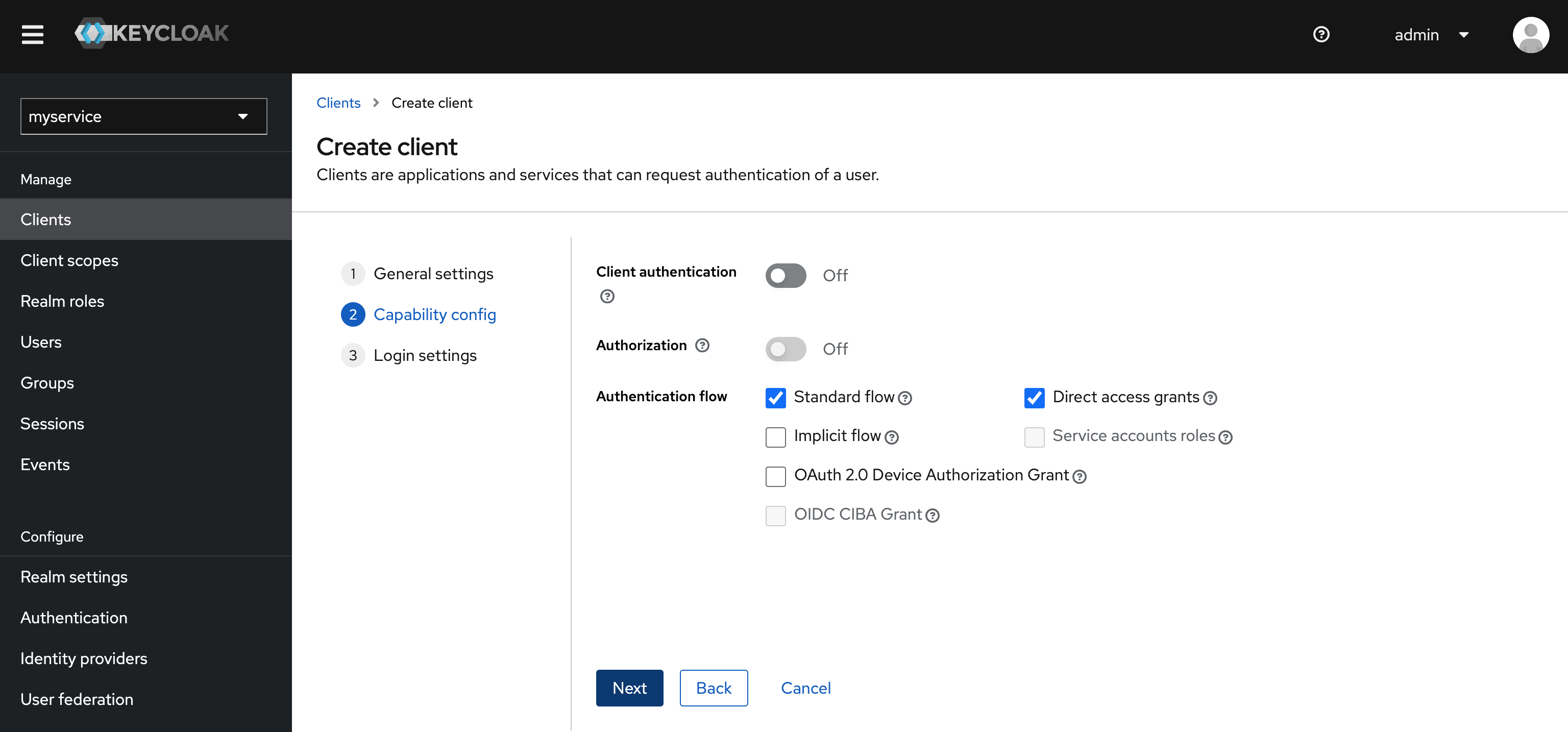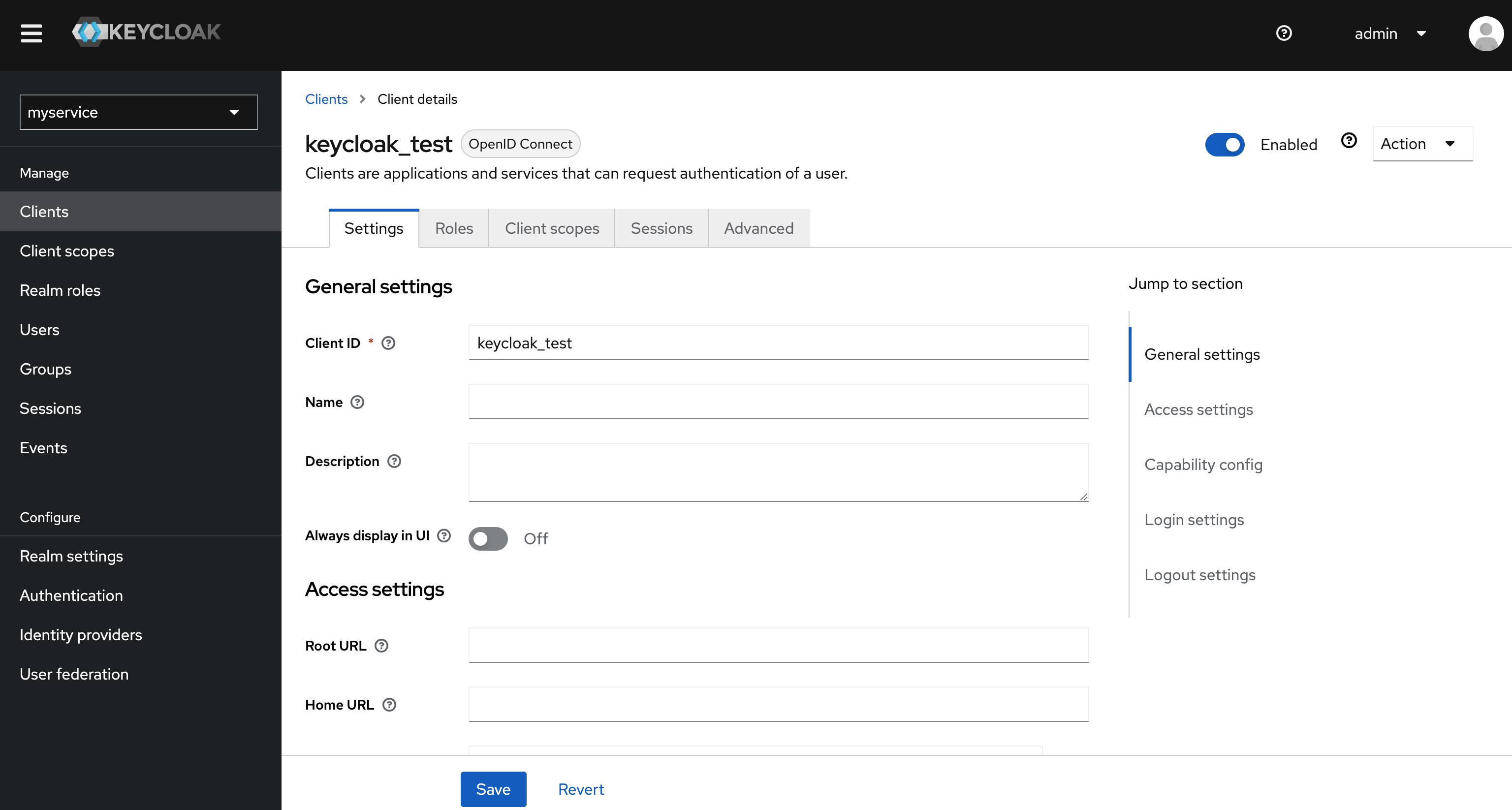 realm 이름(= myservice)와 Client(= keycloak_test)를 입력한다.