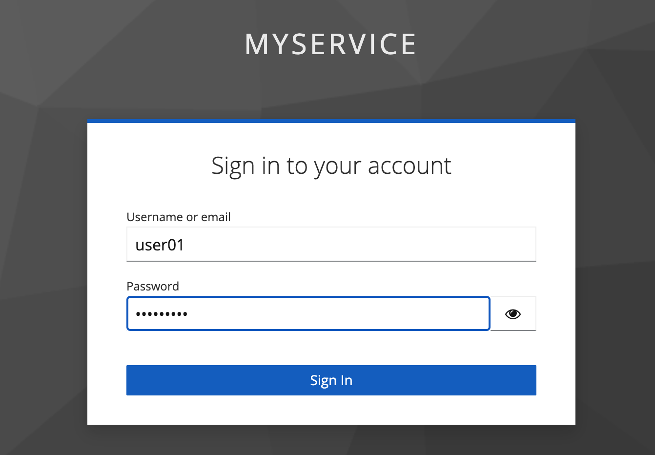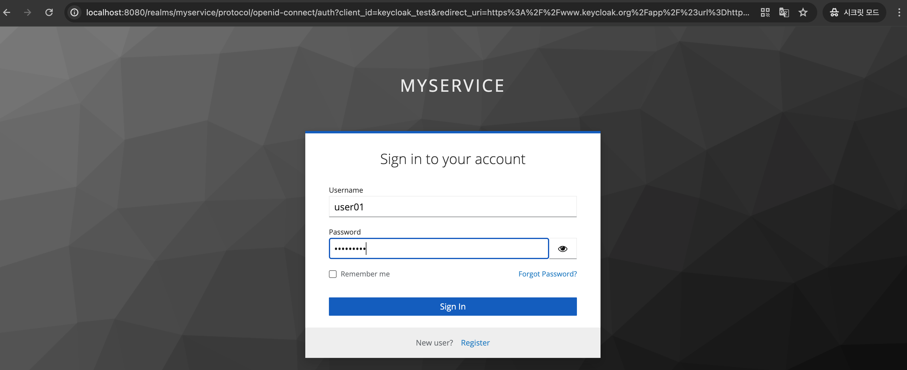 [Sign in] 을 클릭하면 http://localhost:8080/realms/myservice/protocol/openid-connect/auth?client_id=keycloak_test 으로 리디렉션 되며, 로그인 정보를 입력하게 된다.