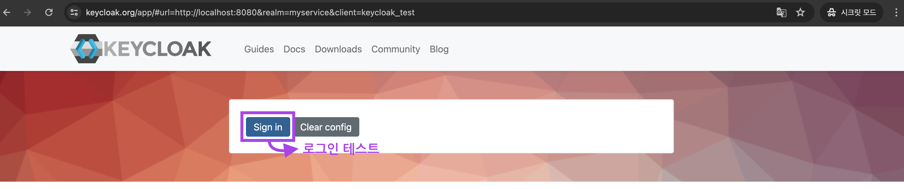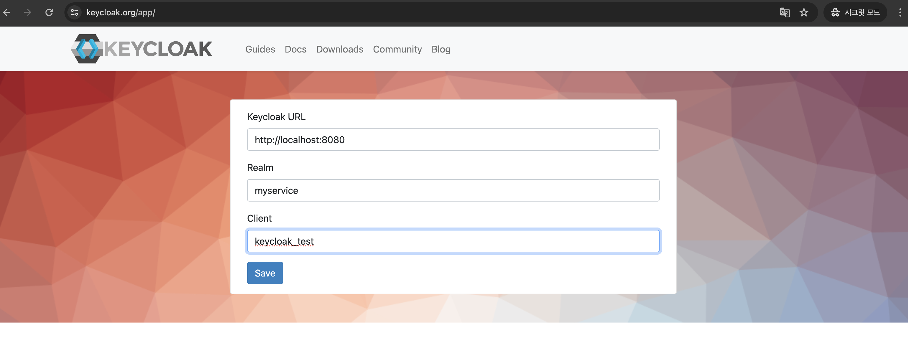 이제, KeyCloak에서 제공해주는 테스트 페이지(https://www.keycloak.org/app/)에 접속하고,