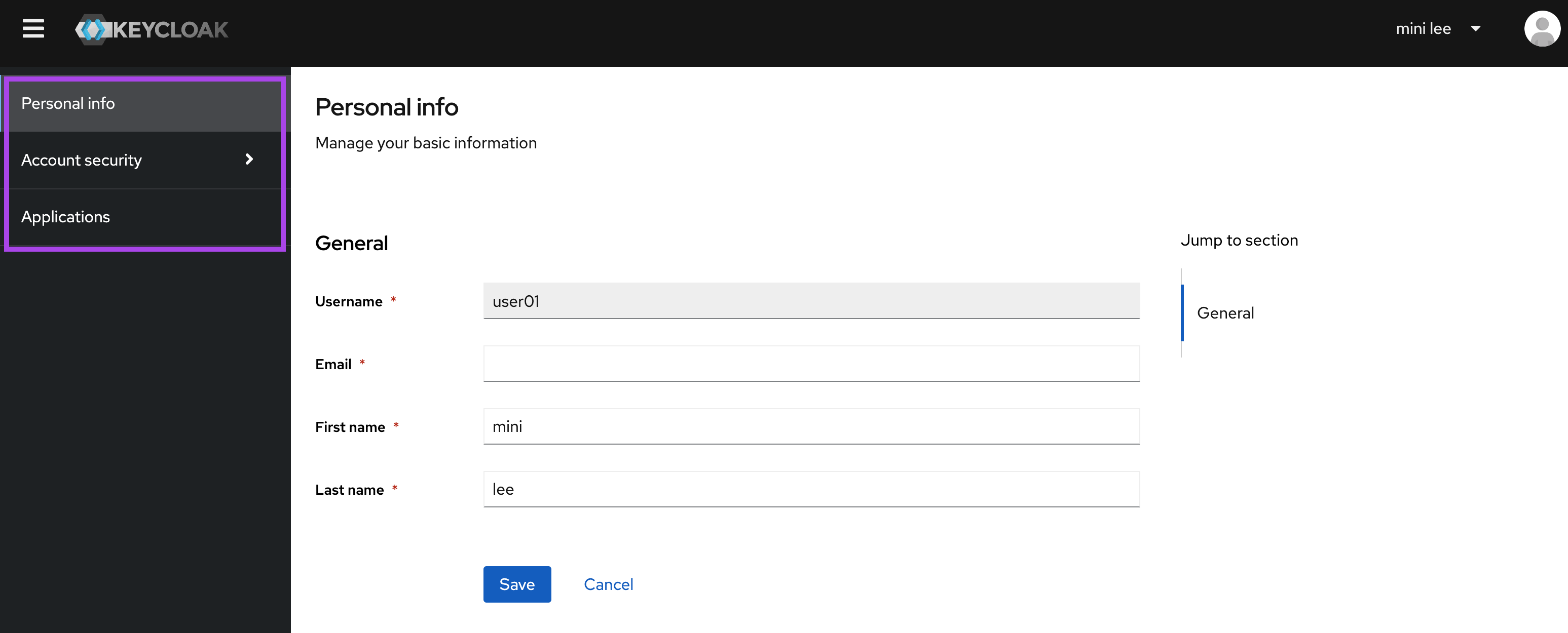 - Identity provider links (아이덴티티 제공자 링크): 외부 아이덴티티 제공자와의 연결 정보, 연결 추가 및 제거.