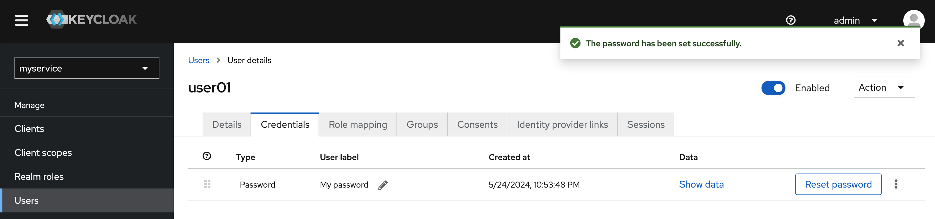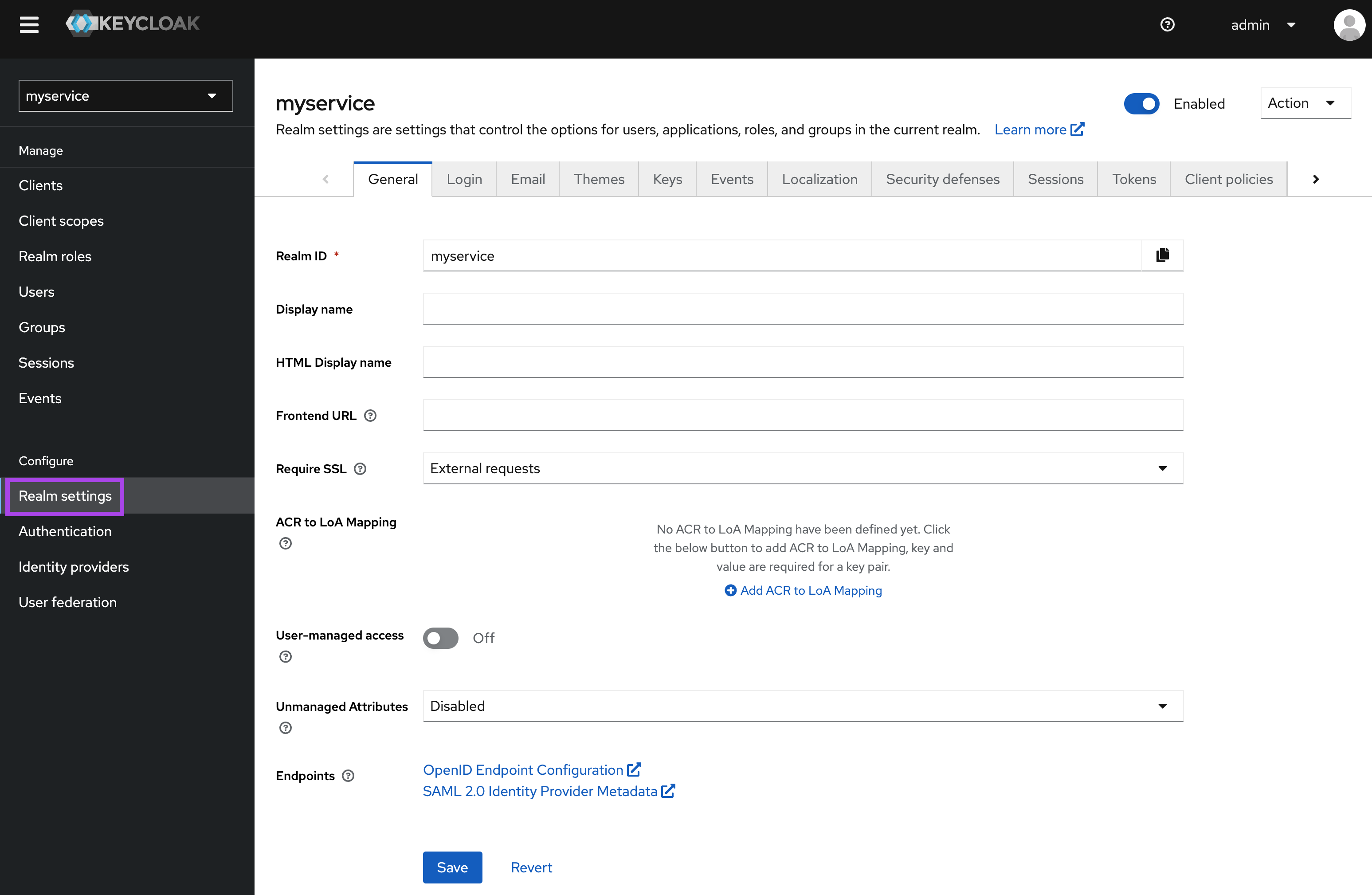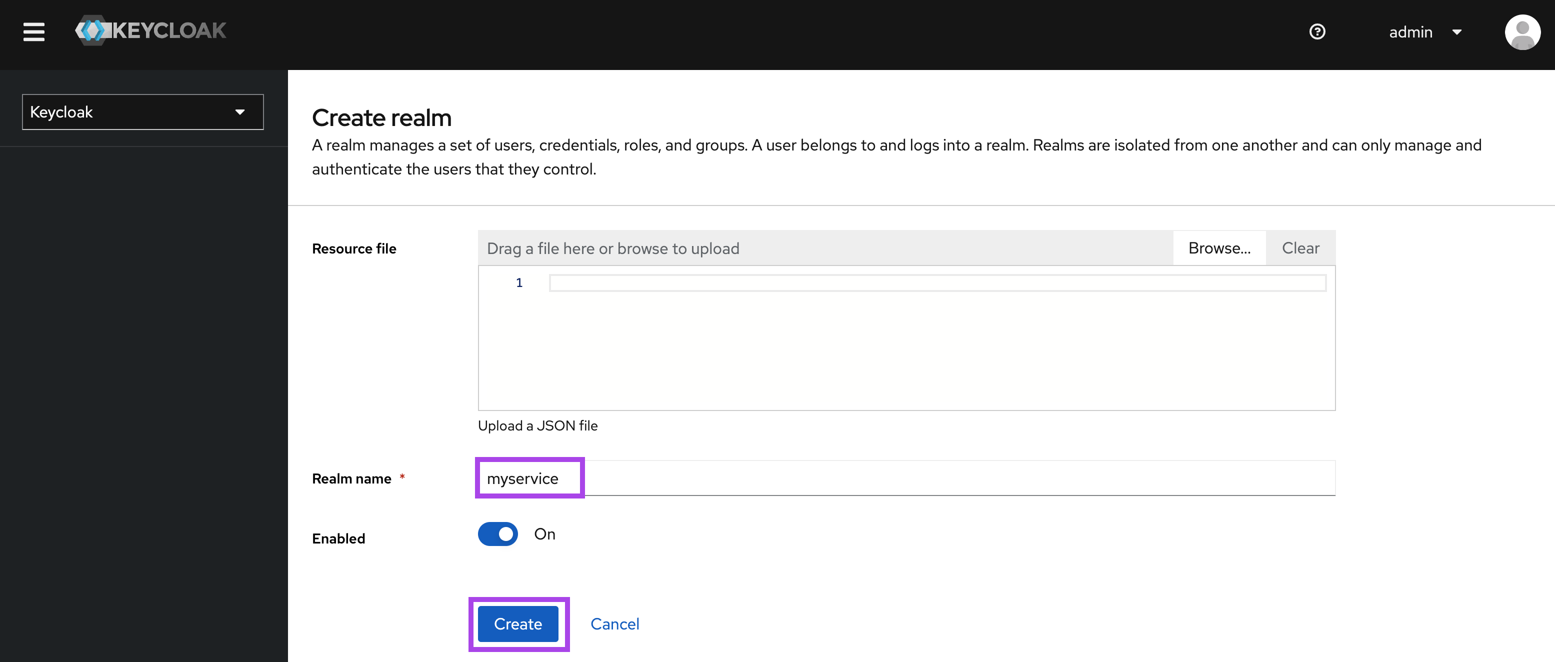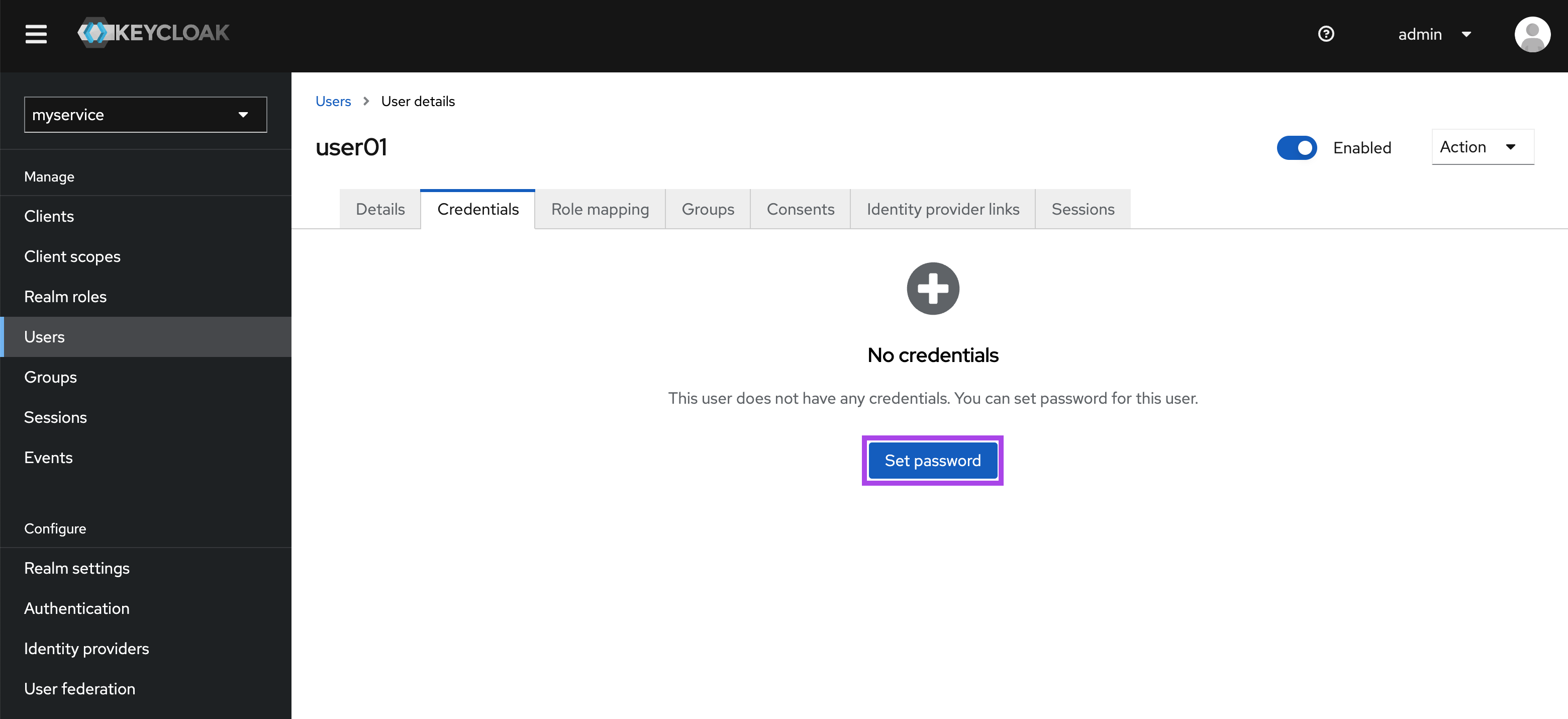 먼저 위에서 생성한 myservice realm에서 사용자를 만들어보자.