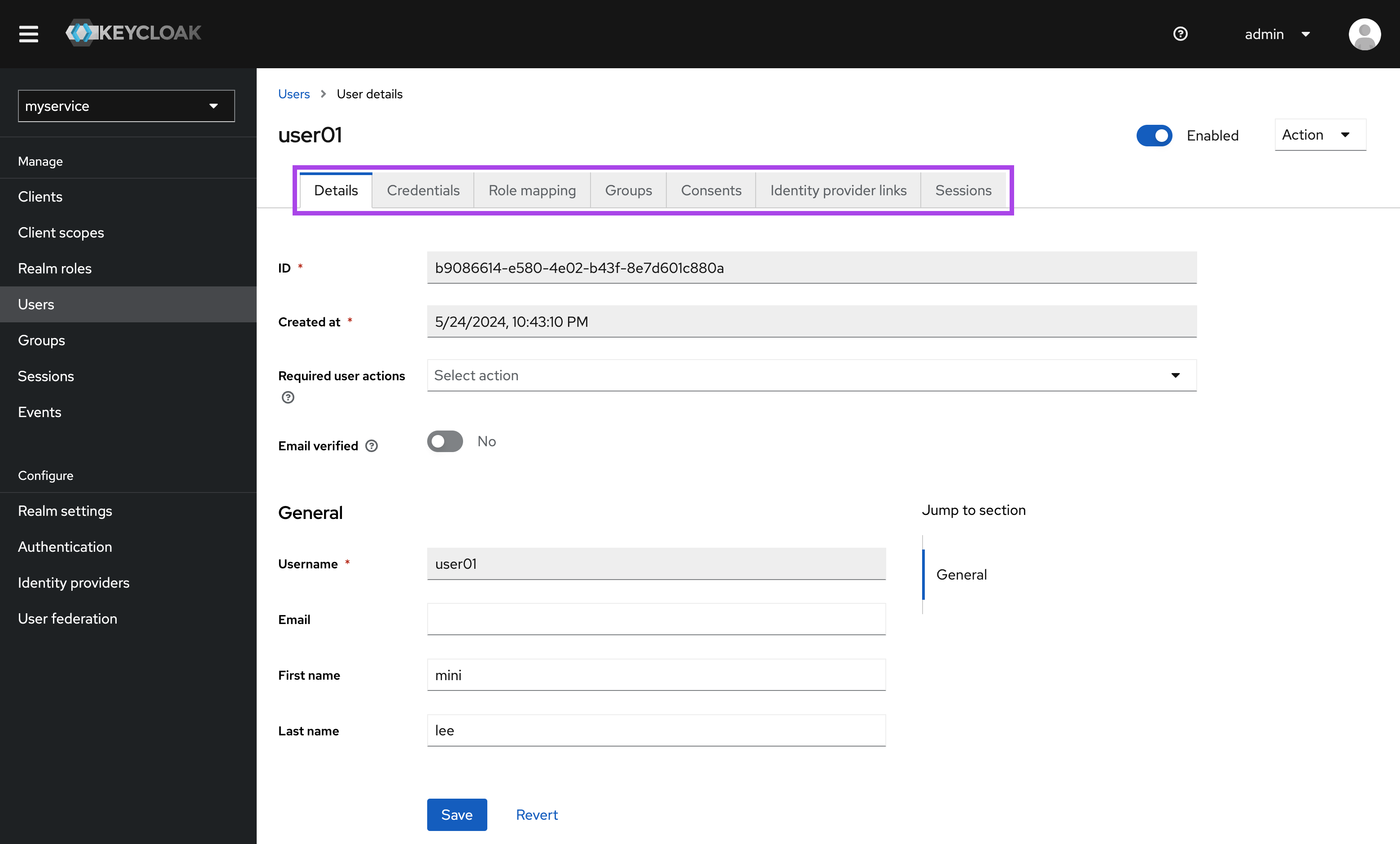 - Details (세부 정보): 사용자 UUID, 생성 시간, 로그인 시 수행해야 할 작업, 이메일 검증 여부 등.