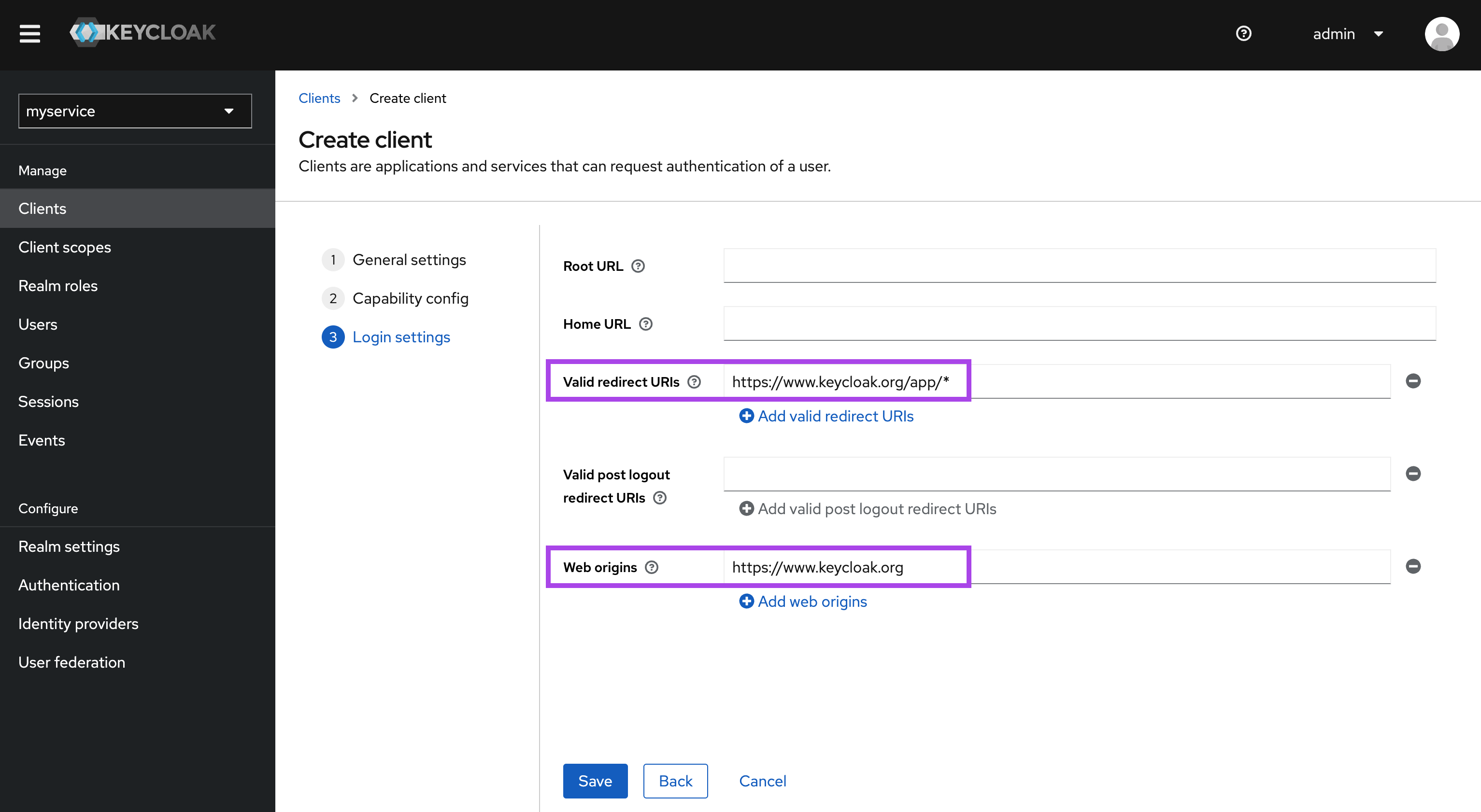 - Valid redirect URIs: https://www.keycloak.org/app/*