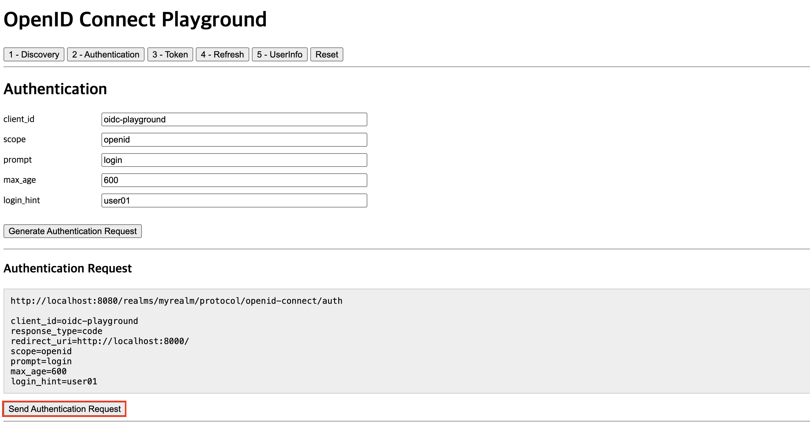 올바른 값을 입력(아래 참고)하고 Generate Authentication Request를 클릭하여 인증요청이 어떻게 생성되는지 확인한다.