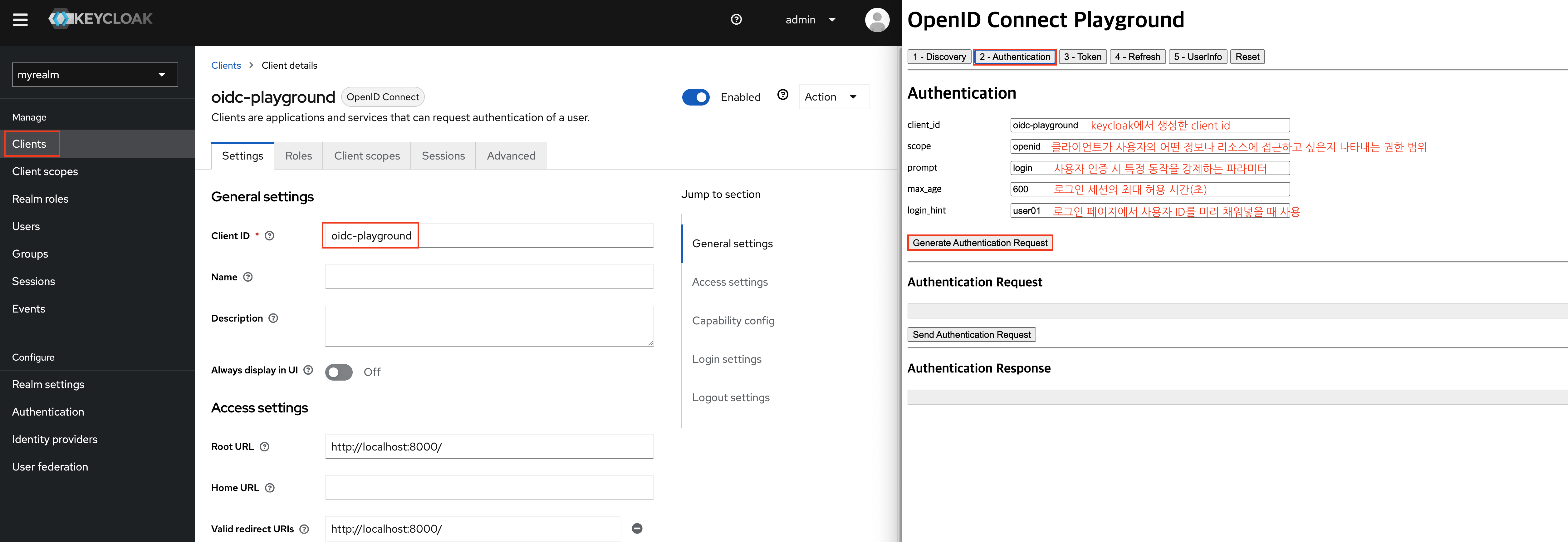 먼저 keycloak에서는 oidc-playground 라는 클라이언트를 생성한다. (realm -> clients -> client생성)