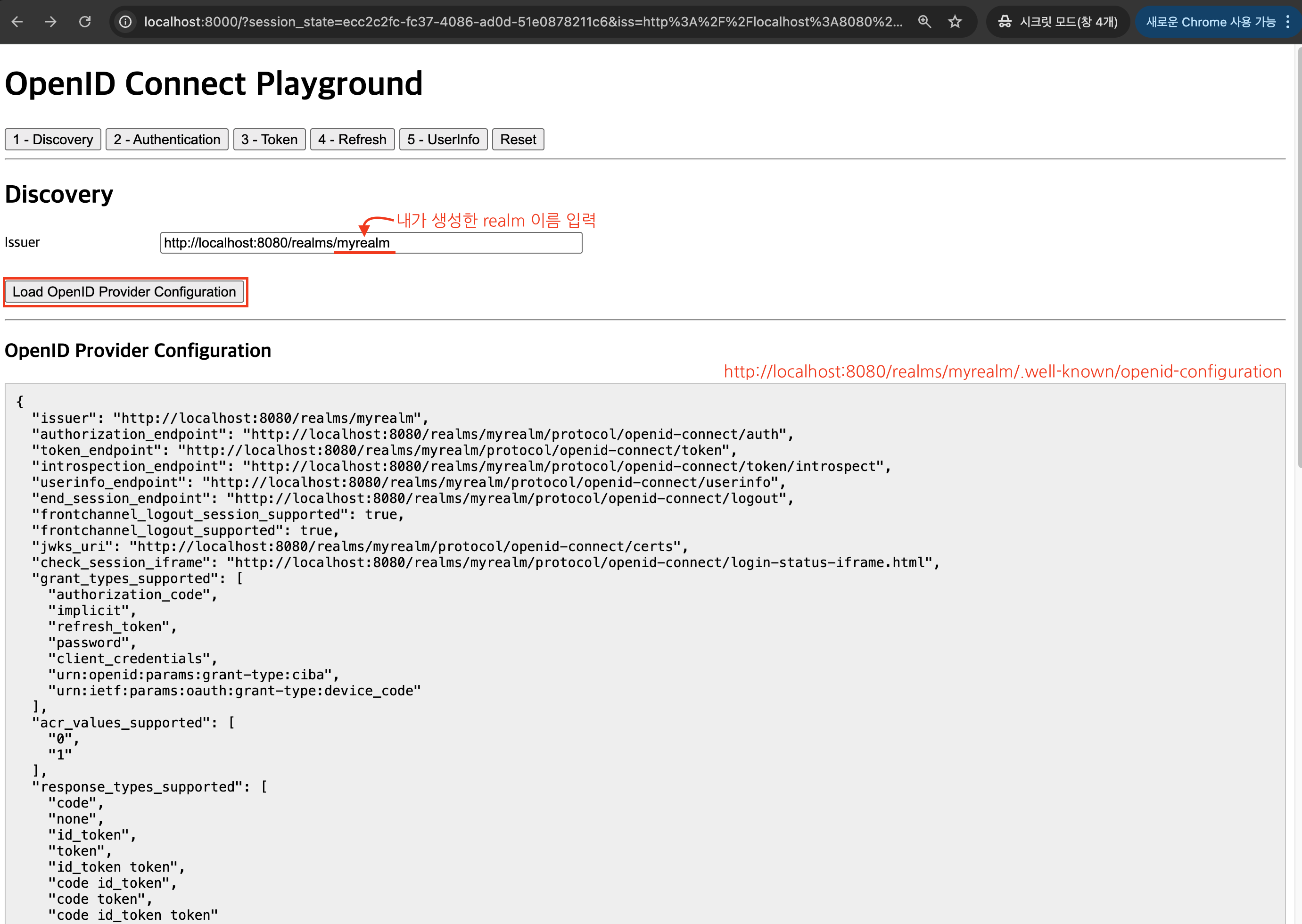 '1 - Discovery' 클릭 및 올바른 Issuer를 입력 후 Load OpenID Provider Configuration을 클릭한다.