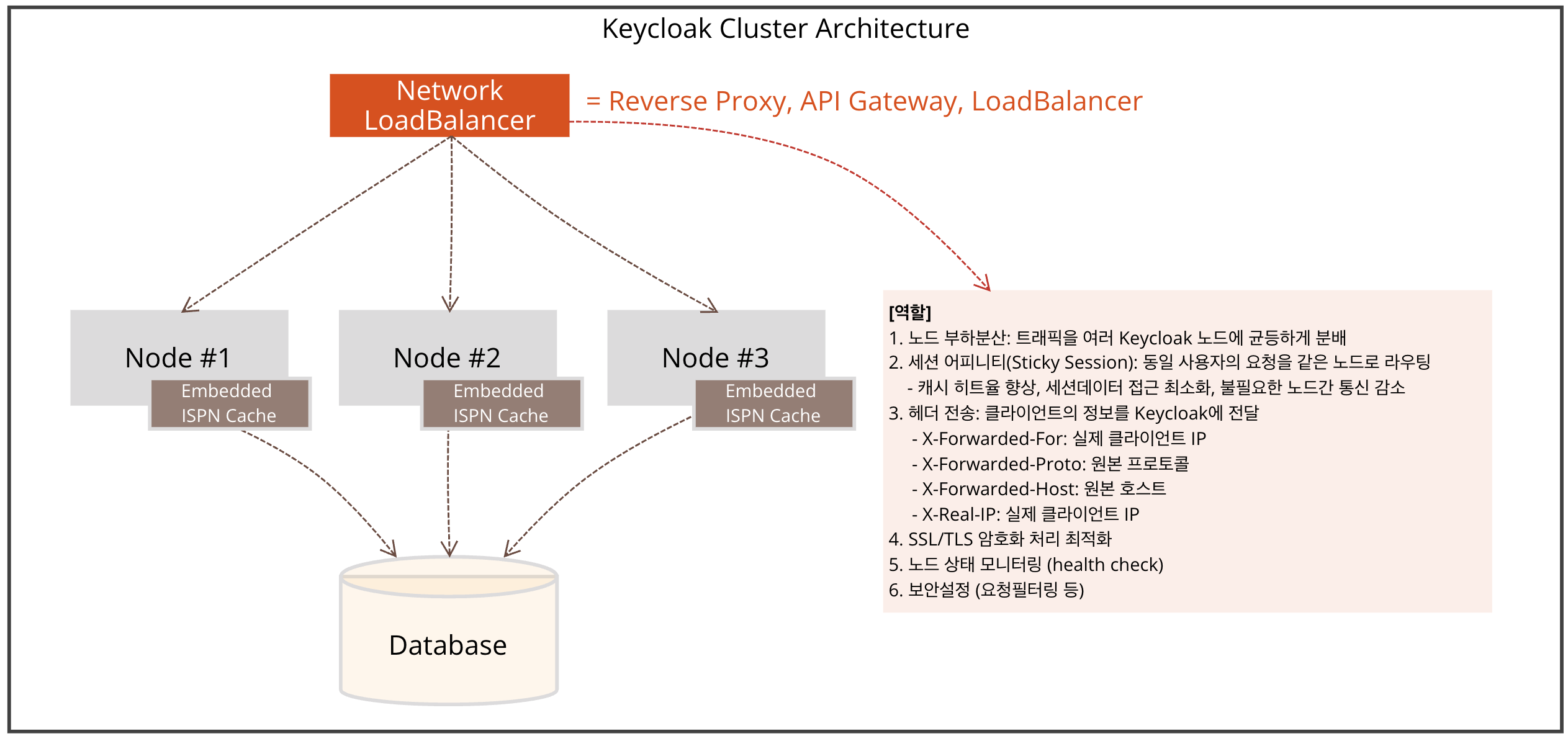 여러대의 Keycloak노드를 사용하므로써, 특정 노드가 중단되도 장애를 방지할 수 있고, 부하에 따라 노드를 확장/축소 함으로써 가용성을 확보할 수 있다.