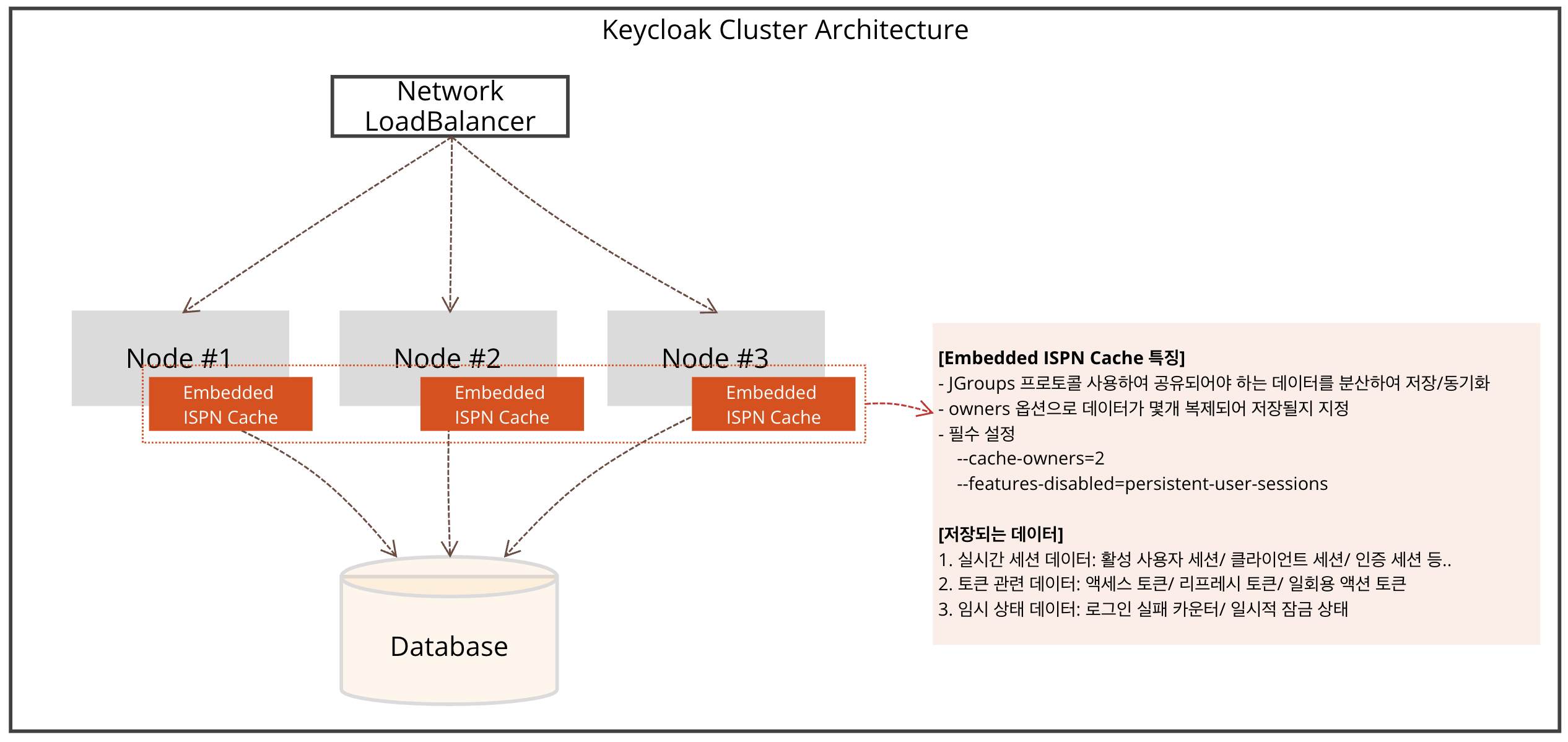 Keycloak은 Infinispan을 기반으로 (key-value In-memory) 클러스터 캐시를 구성할 수 있도록 제공한다.