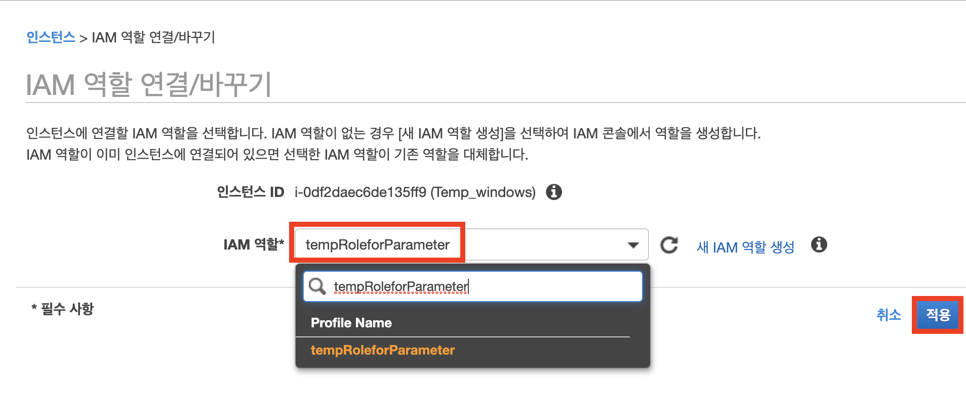 IAM 콘솔에서 생성한 IAM역할(tempRoleforParameter)을 선택하고 "적용"을 클릭합니다.