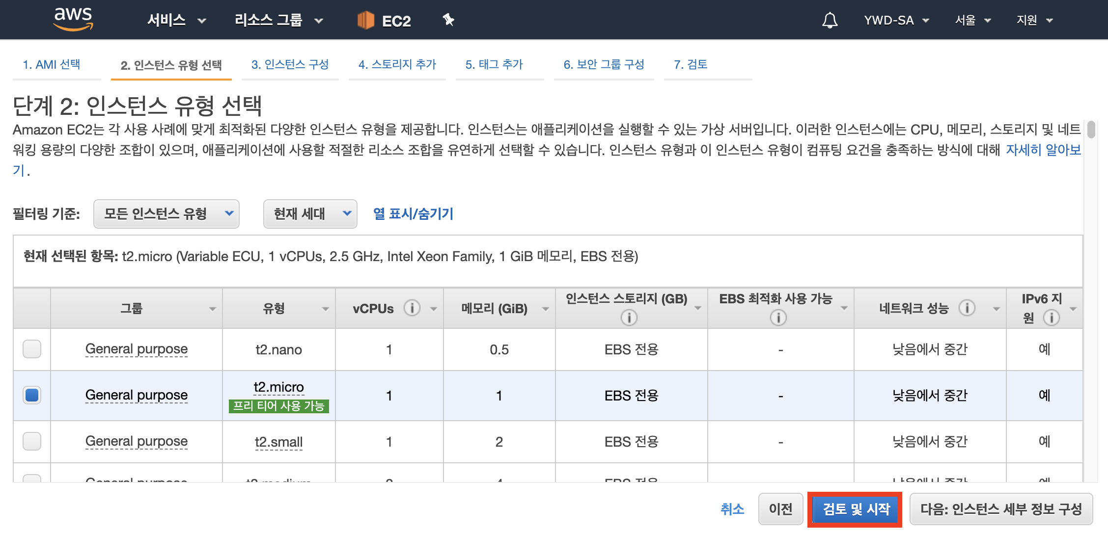 인스턴스 유형은 기본으로 선택하고 "검토 및 시작"을 클릭합니다.