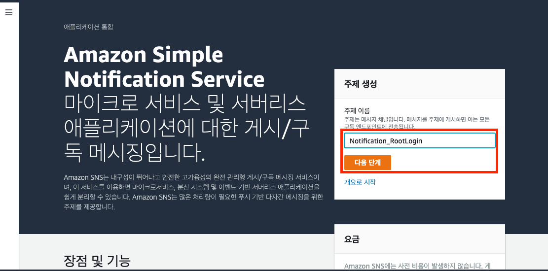 이번 단계에서는 Amazon SNS (simple notification service)를 이용하여 e-mail 을 발송할 수 있도록 설정하겠습니다.