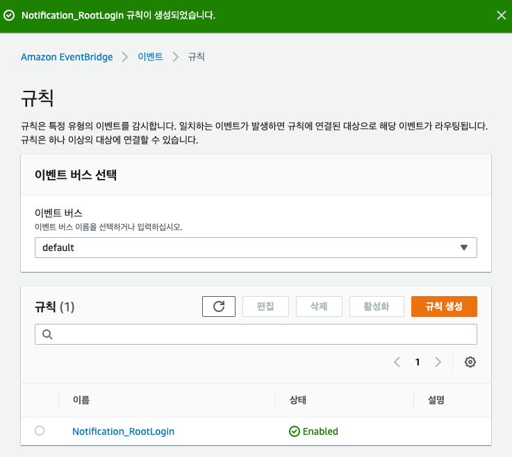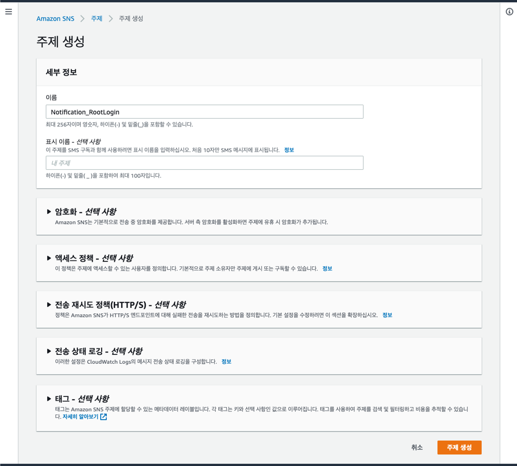 주제(Notification_RootLogin)이 정상적으로 생성되었습니다. 이제 이 주제를 구독하도록 새로운 구독을 생성합니다.