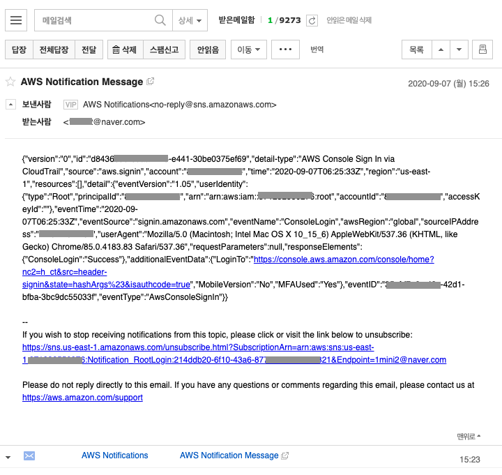 루트 계정으로 로그인 후 설정한 Email로 Notification이 오는지 확인합니다.
