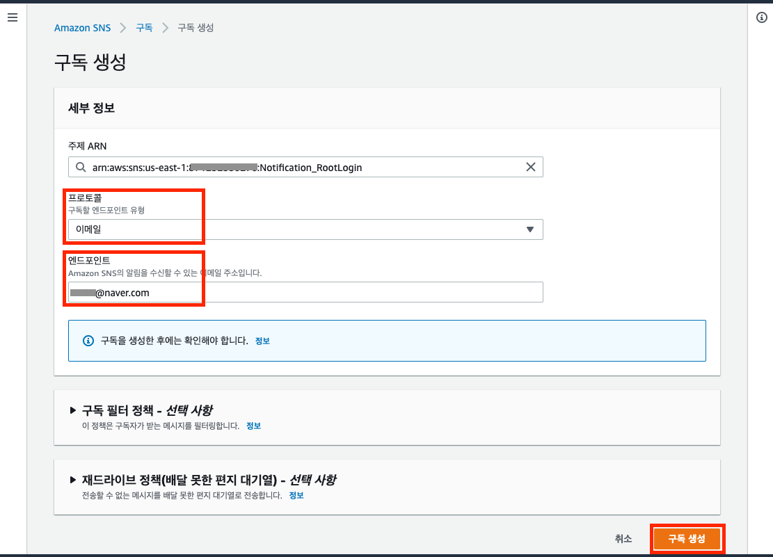 아래와 같이 알맞게 설정값을 넣고 "구독생성"을 클릭합니다.