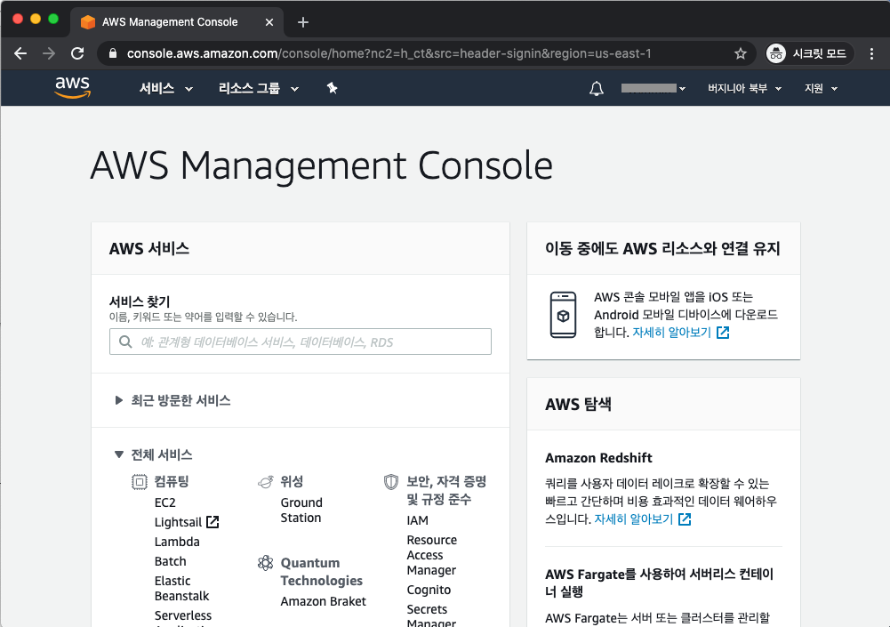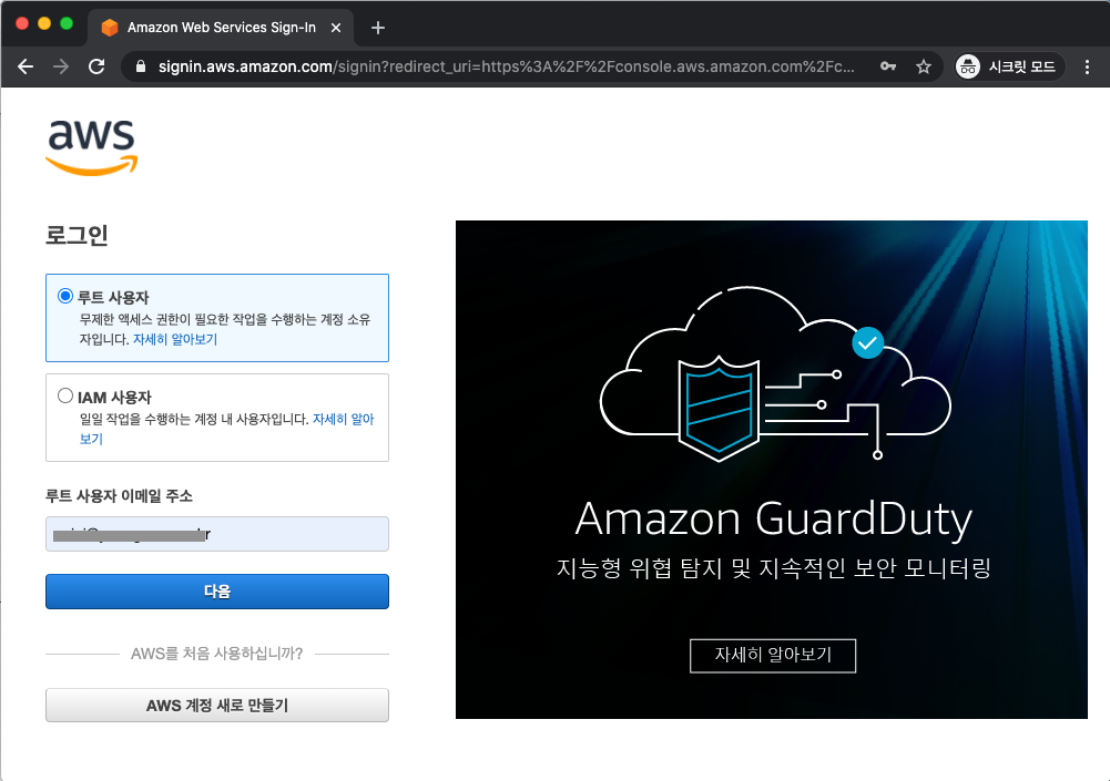 크롬 시크릿창을 하나 킨 후에, 시크릿 브라우저에서 AWS루트계정으로 로그인 하겠습니다.