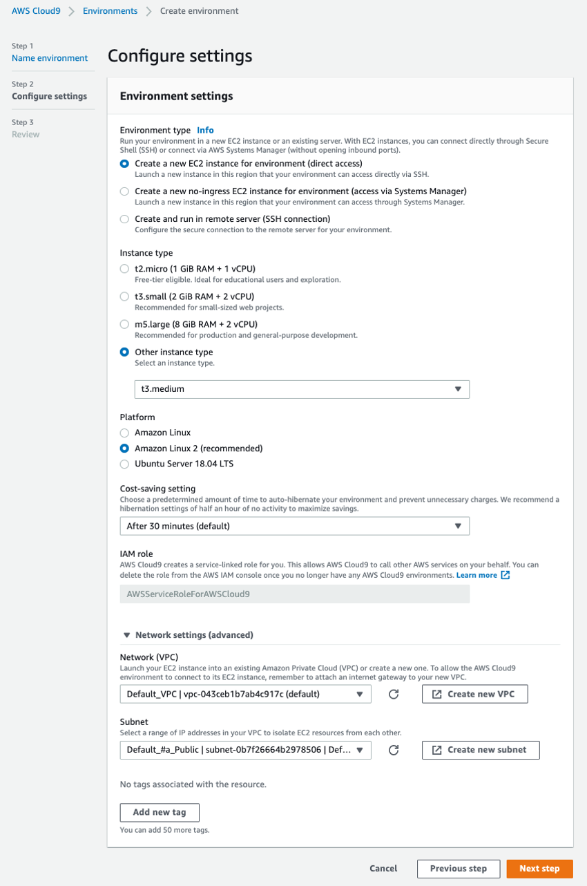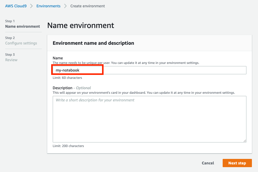 cloud9 이름을 입력 후 "Next step"을 클릭합니다.