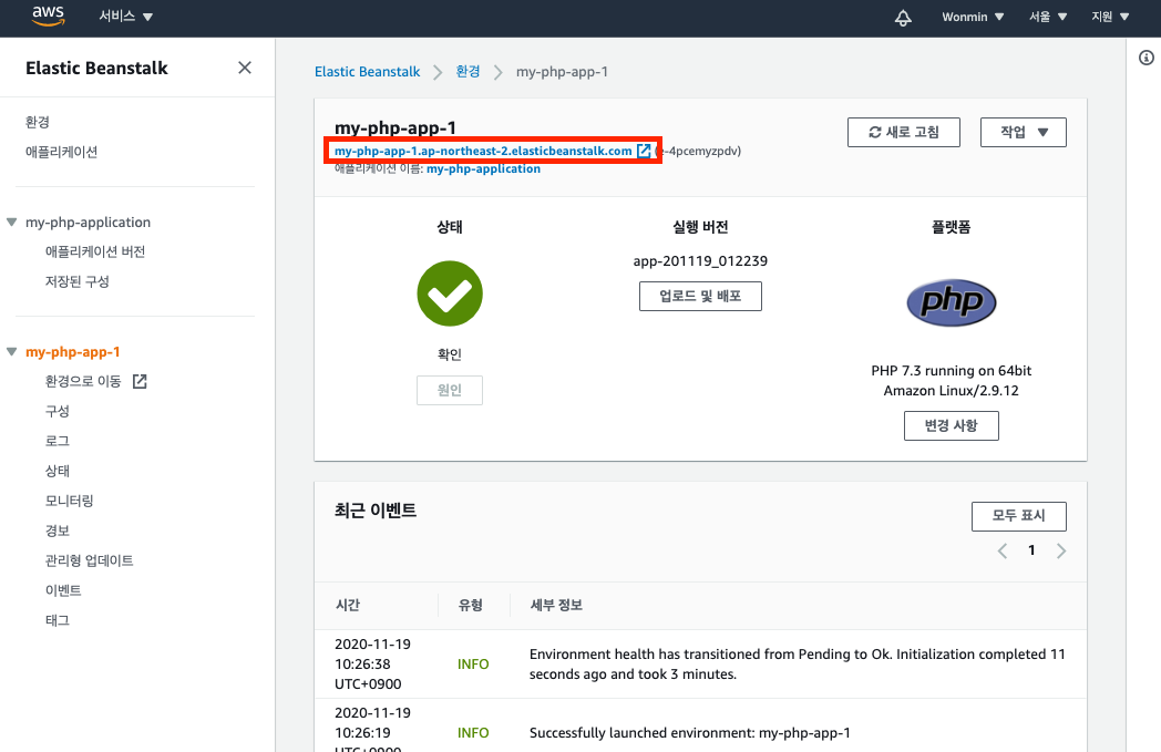 my-php-app-1 환경을 클릭하고, 상단의 URL을 클릭합니다.