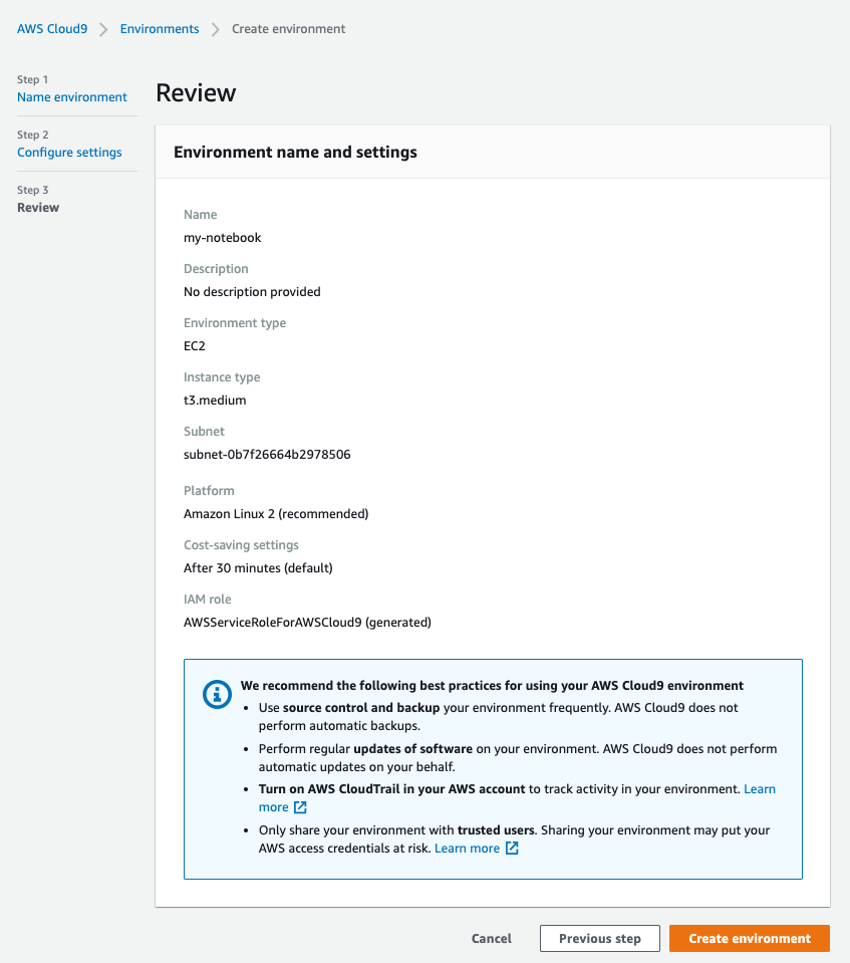 세번째 스탭, 잘 설정 되었는지 확인합니다. 이후 "Create envirenment"를 클릭하여 환경을 생성합니다.