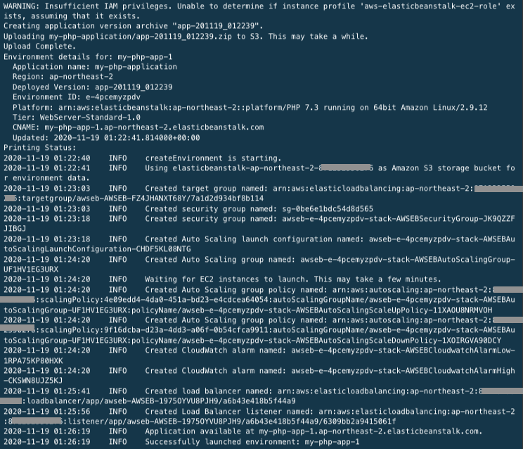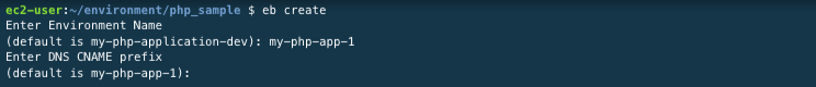 명령어는 아주 간단합니다. eb init을 했던 php_sample 디렉토리에서 eb create 명령어를 실행합니다.
