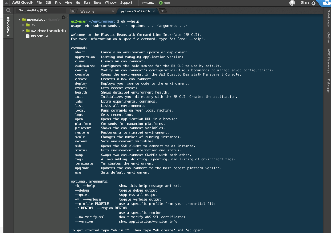 ec2-user:~/environment $ echo 'export PATH="/home/ec2-user/.ebcli-virtual-env/executables:$PATH"' >> ~/.bash_profile && source ~/.bash_profile