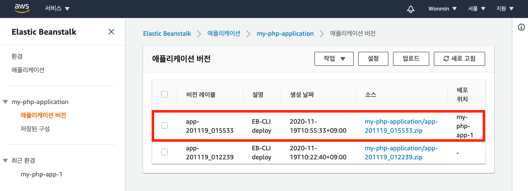 이렇게 새로 배포된 버전은 콘솔 "어플리케이션 버전"에서 관리할 수 있습니다.