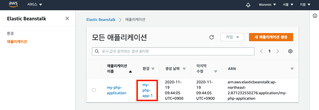 환경의 이름을 입력합니다. 저는 my-php-app-1로 만들었습니다.