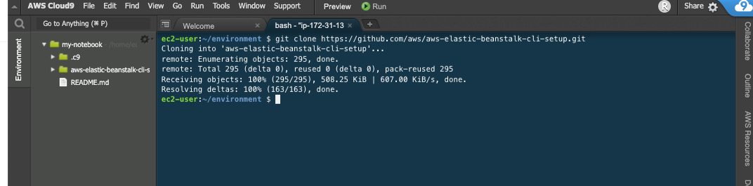 ec2-user:~/environment $ git clone https://github.com/aws/aws-elastic-beanstalk-cli-setup.git