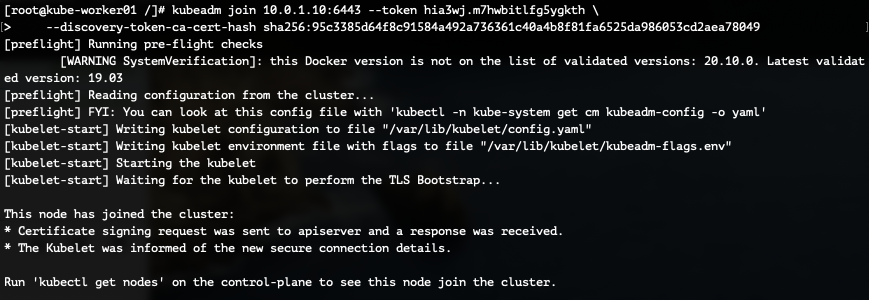 [root@kube-worker01 /]# kubeadm join 10.0.1.10:6443 --token hia3wj.m7hwbitlfg5ygkth \