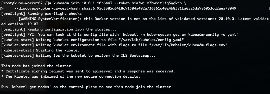 [root@kube-worker02 /]# kubeadm join 10.0.1.10:6443 --token hia3wj.m7hwbitlfg5ygkth \