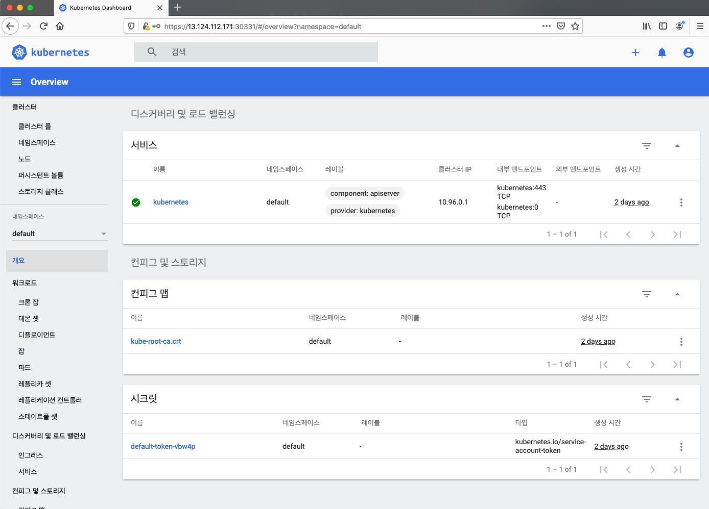 이제 kubenetes-dashboard 네임스페이스의 오브젝트(리소스)들을 살펴봅시다!
