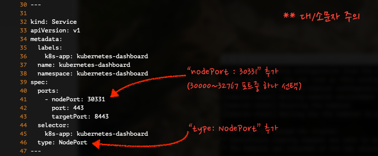여기에 kubenetes-dashboard 인 네임스페이스로 변경합니다.