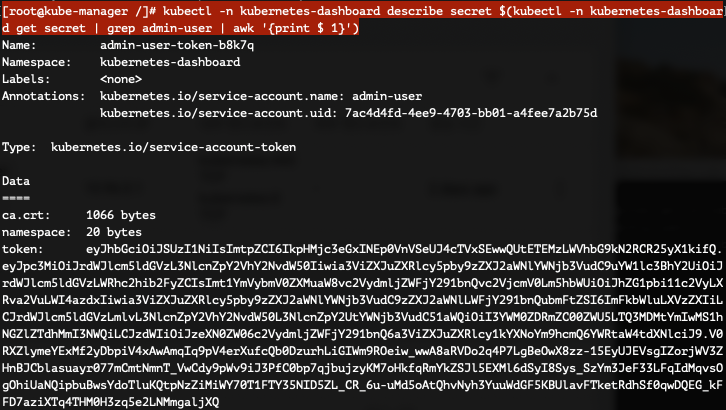 [root@kube-manager /]# kubectl -n kubernetes-dashboard describe secret $(kubectl -n kubernetes-dashboard get secret | grep admin-user | awk '{print $ 1}')
