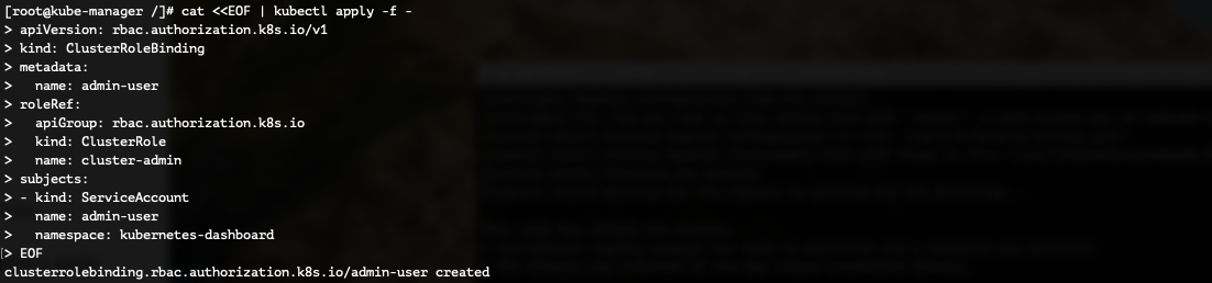 아래 명령어를 복사 붙여넣기 한 후 실행하면 "clusterrolebinding.rbac.authorization.k8s.io/admin-user created" 라고 출력됩니다.