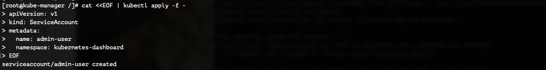 아래 명령어 복사 붙여넣기 하신 후 실행 하면 "serviceaccount/admin-user created" 라는 결과를 확인할 수 있습니다.